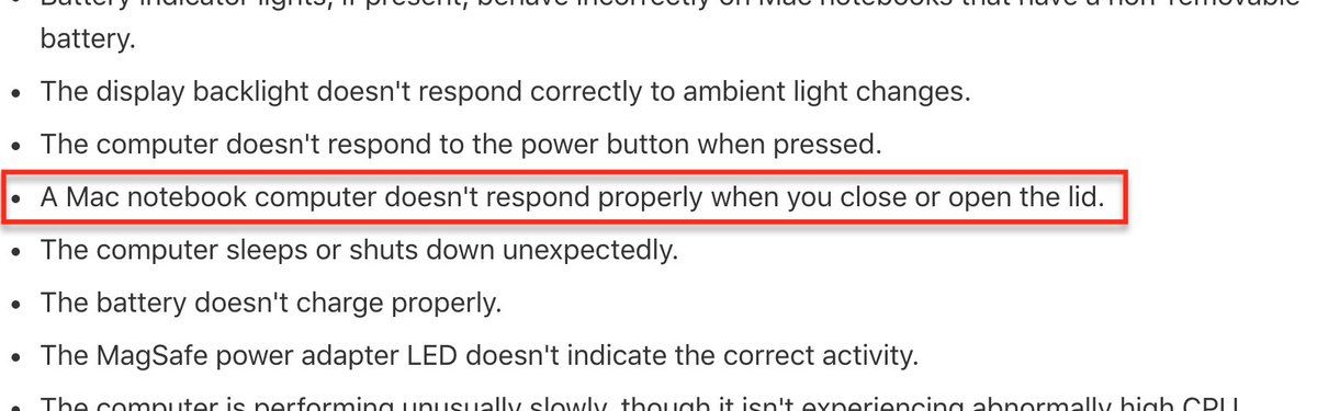 axbom > Then I remembered a list of the things that the SMC resets. One of them being how the computer reacts to opening the screen/lid. >